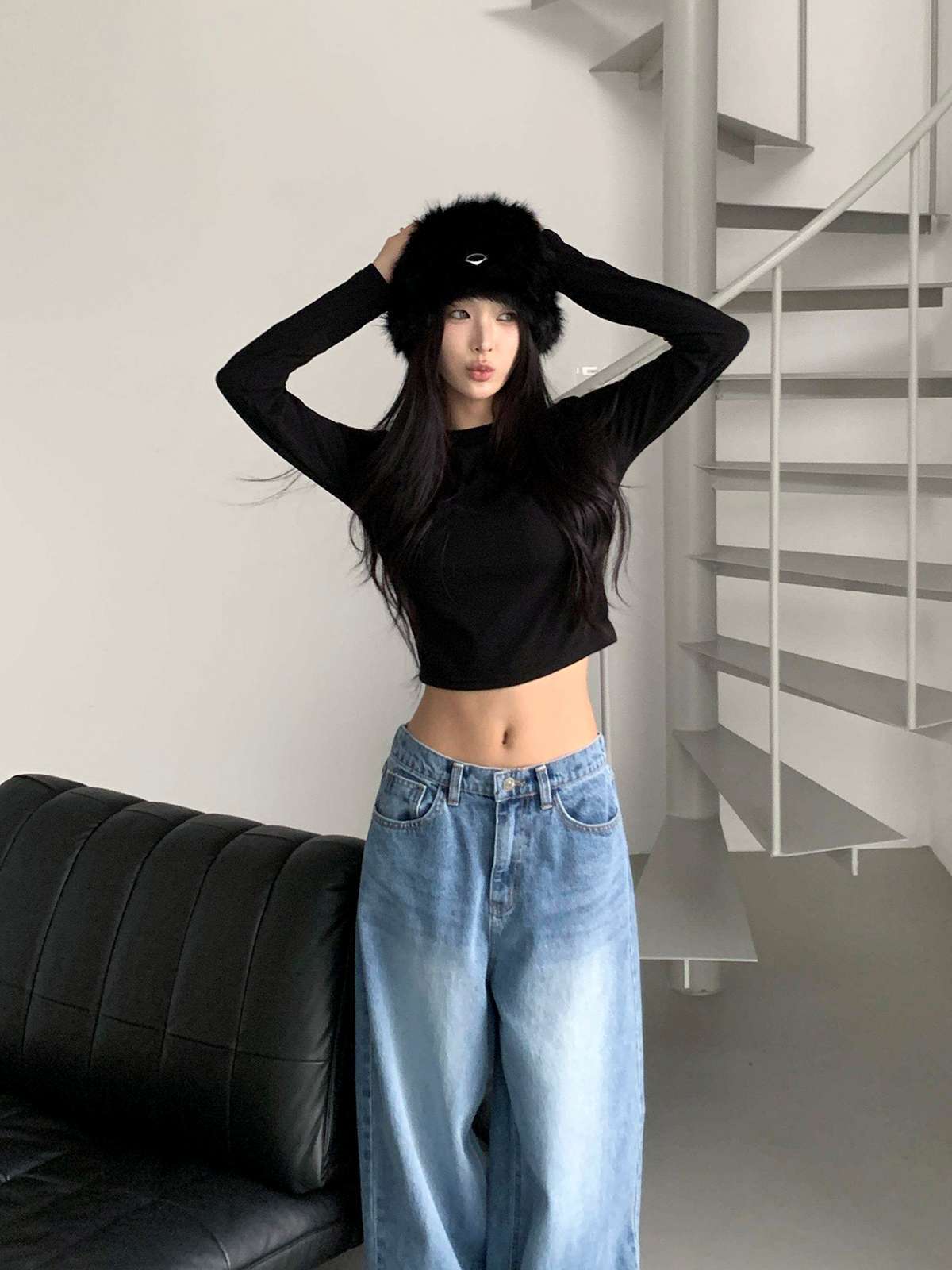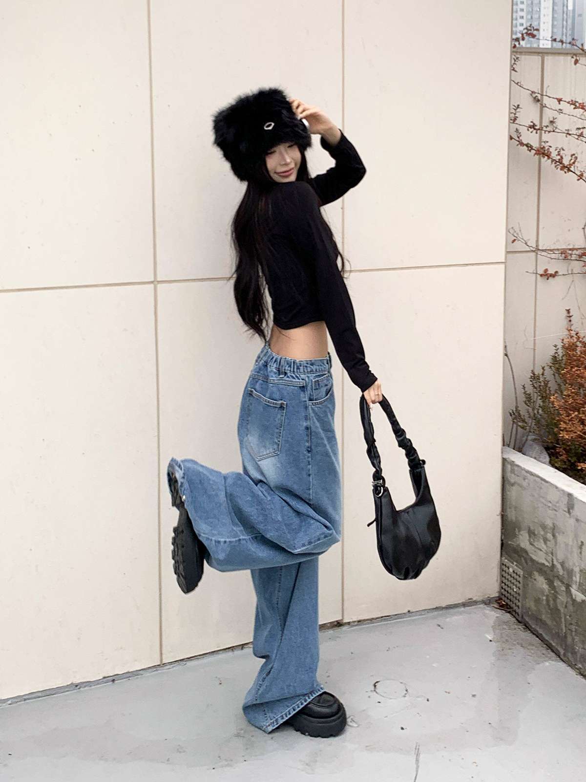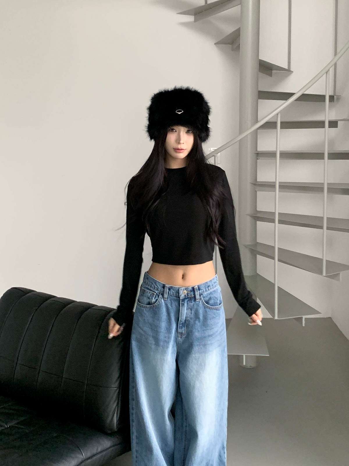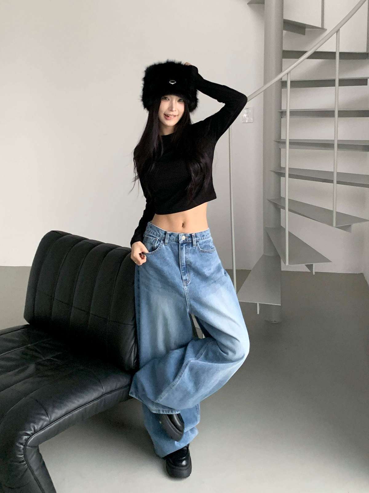 하이웨스트 하의와 매치하면 다리가 길어 보이며,
