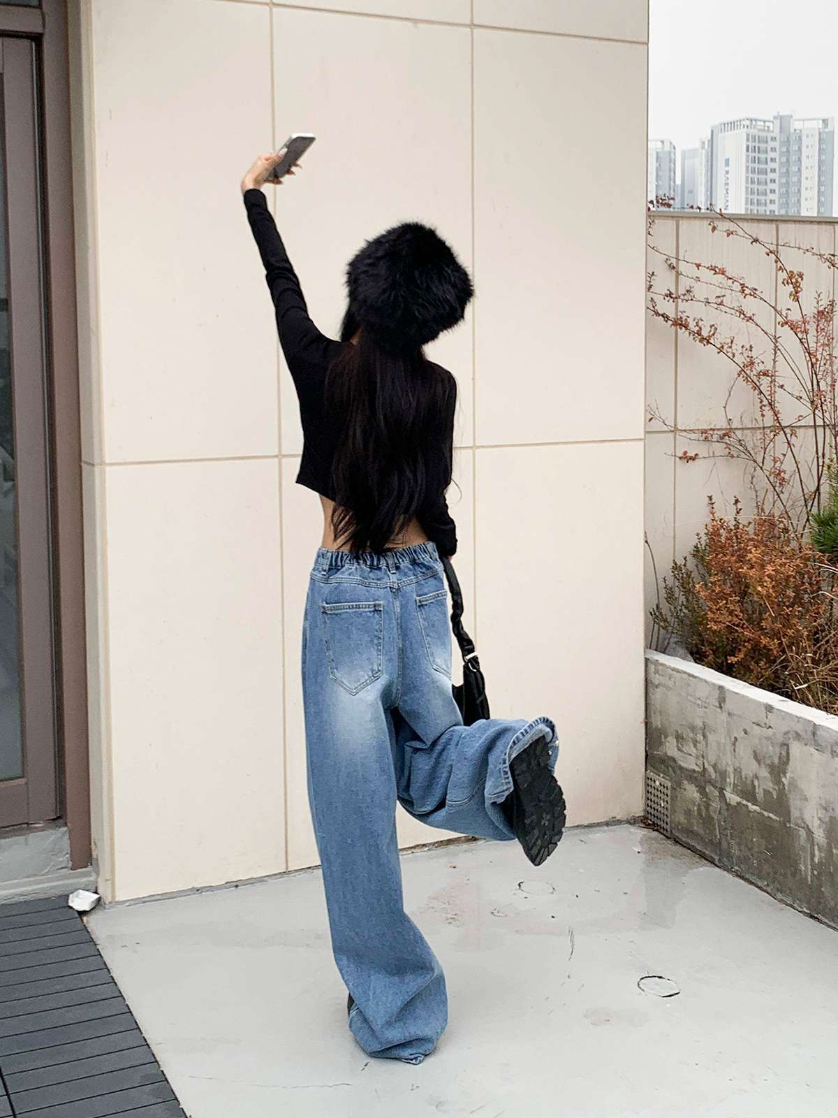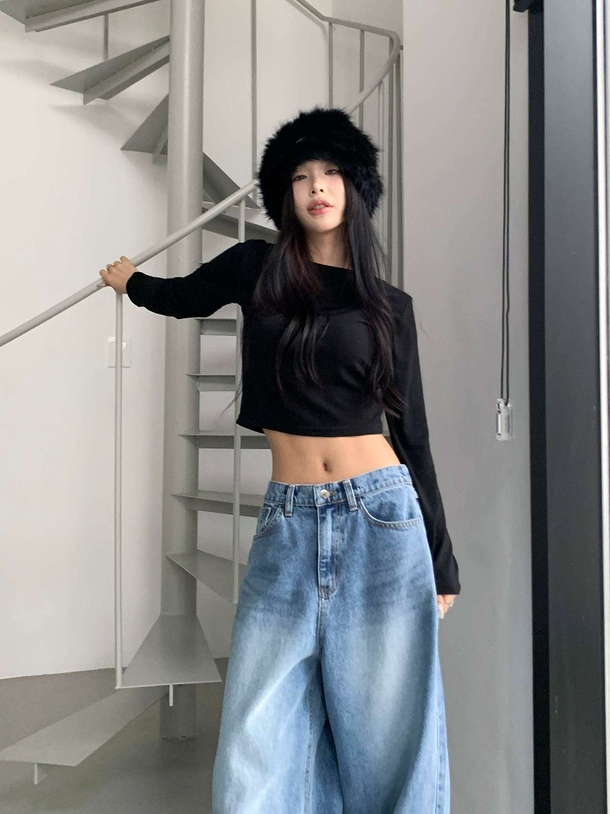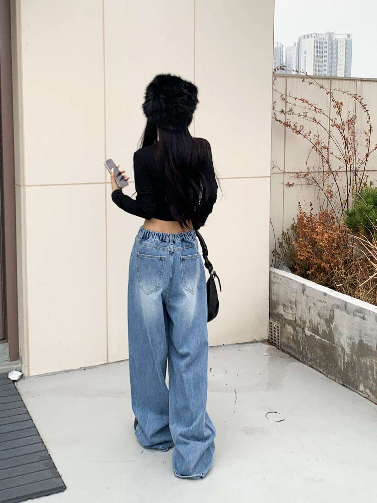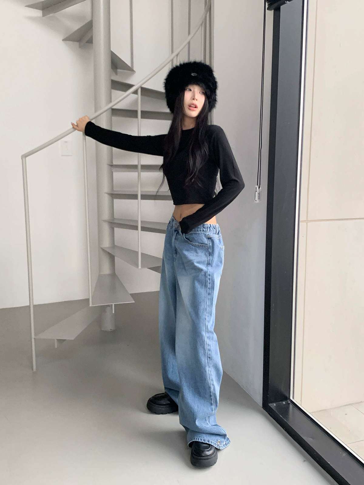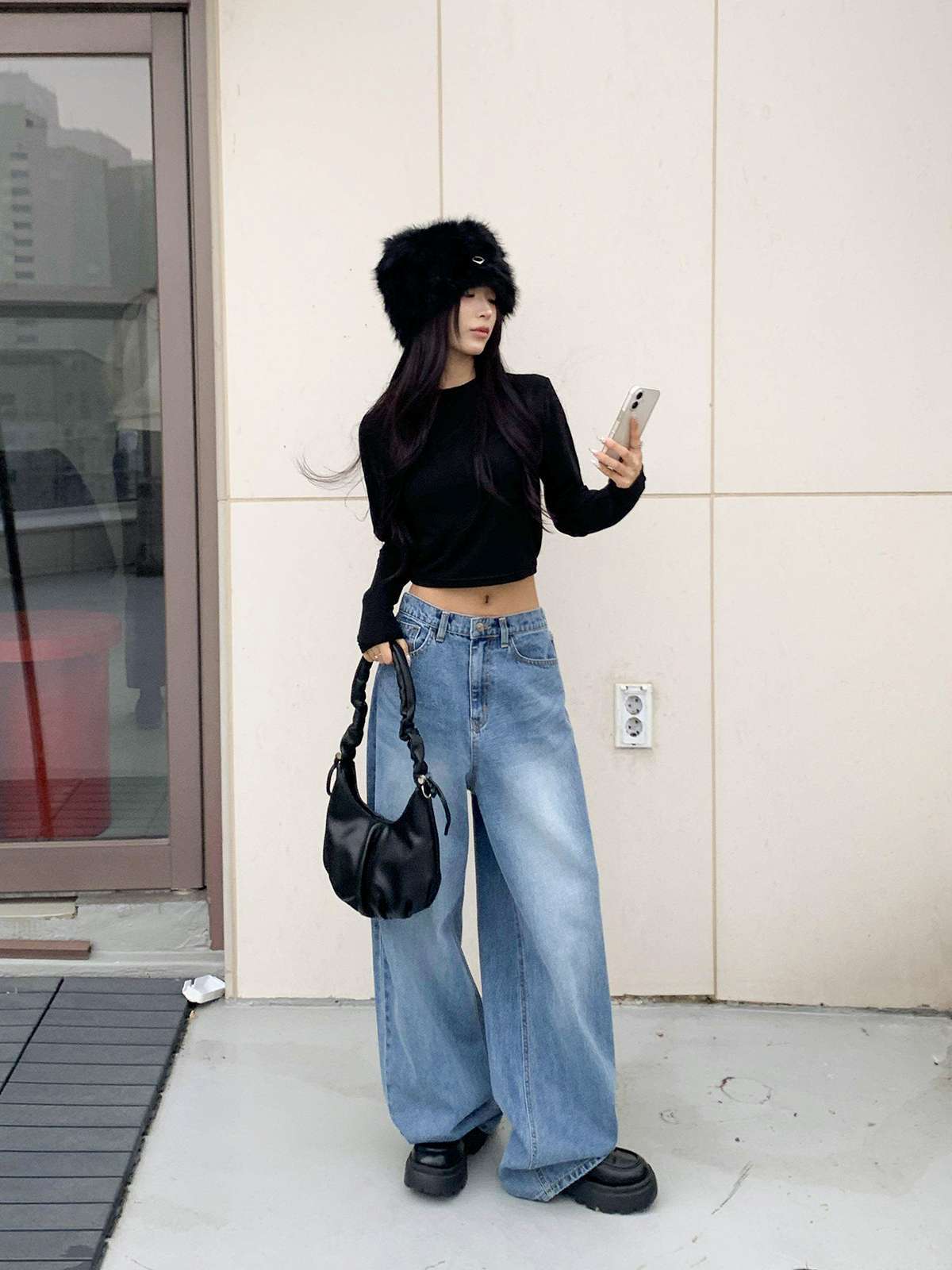 하이웨스트 하의와 매치하면 다리가 길어 보이며,
